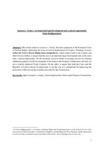 This article analyses Joannou v. Turkey, the latest judgment of the European Court of Human Rights addressing the issue of forced displacement in Cyprus. Situating Joannou within the Court's forced displacement jurisprudence, which relates both to the Cypriot and other frozen conflicts, it argues that the case is an important legal development and, at the same time, a missed opportunity. On the one hand, Joannou builds on existing case law by offering additional guidance for the development of the Immovable Property Commission, the body set up to remedy displaced Greek Cypriots. On the other, it argues that both the Court and the Republic of Cyprus missed an opportunity to use the case as a springboard for improving the procedures followed and the remedies provided by the Commission.