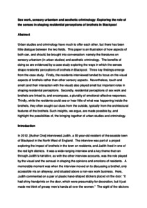 Urban studies and criminology have much to offer each other, but the links between the two have so far been underexplored. This article is an illustration of how aspects of both can, and should, be brought into conversation: namely the literatures on sensory urbanism (in urban studies) and visual criminology. The benefits of doing so are evidenced by a case study exploring the ways in which the senses shape residents’ perceptions of brothels in Blackpool. Three key findings emerge from the case study. First, the residents interviewed tended to focus on the visual aspects of brothels rather than other sensory aspects. Nevertheless, touch and smell (and their interaction with the visual) also played small but important roles in shaping residential perceptions. Second, residential perceptions of sex work and brothels are linked to, and encompass, a plurality of emotional responses. Third, while the residents could see or hear little of what was happening inside the brothels, they often sought out sensory clues from outside, typically drawn from the architectural features of the brothels. Such insights, we argue, are made possible by, and highlight the possibilities of, the bringing together of urban studies and criminology.