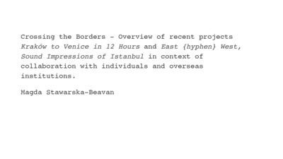 Crossing the Borders - Overview of recent projects Kraków to Venice in 12 Hours and East {hyphen} West, Sound Impressions of Istanbul in context of collaboration with individuals and overseas institutions.