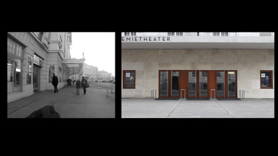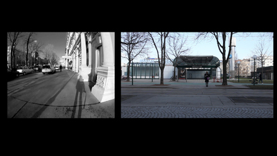 The video places this this urban journey against two narratives. On the left screen: black and white slides of Kindermann seen at a distance. The images flicker to the rhythm of his own narration in German. Simultaneously, on the right screen: a fixed shot colour video of the places discussed in the narrative. These seem to be associated the flow of the artist’s voice, telling the same story in English, therefore adding a sense of familiarity to the English-speaking auditor.