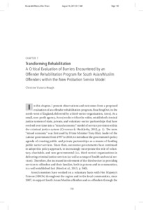 Hough, Christine Victoria (2017) Transforming rehabilitation: A critical evaluation of barriers encountered by an offender rehabilitation program for South Asian / Muslim offenders within the new probation service model. In: After Prison: Navigating Employment and Reintegration. Wilfrid Laurier University Press (WLU Press), Waterloo, Ontario, pp. 159-180. ISBN 9781771123167