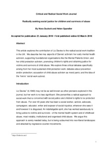 This article explores the contribution of Liz Davies to the radical social work tradition in the UK. We describe two key aspects of Davies’s activism: her early mental health activism, supporting foundational organisations like the Mental Patients Union; and her child protection activism, promoting children’s rights and obtaining justice for victims and survivors of child abuse. We explore three critical debates specifically arising from her most sustained child protection work: debates about prevention and/or protection; the accusation of child abuse activism as moral panic; and the idea of the ‘heroic’ social work activist.