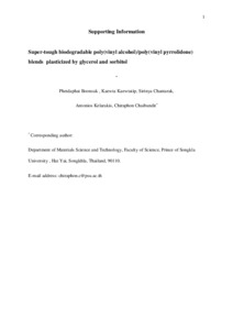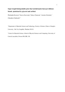 Boonsuk, Phetdaphat, Kaewtatip, Kaewta, Chantarak, Sirinya, Kelarakis, Antonios orcid iconORCID: 0000-0002-8112-5176 and Chaibundit, Chiraphon (2018) Super-tough biodegradable poly(vinyl alcohol)/poly(vinyl pyrrolidone) blends plasticized by glycerol and sorbitol. Journal of Applied Polymer Science, 135 (26). p. 46406. ISSN 0021-8995