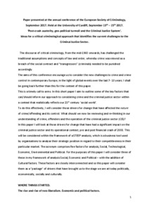 Hough, Christine Victoria (2017) Post-crash austerity, geo-political turmoil and the Criminal Justice System: Ideas for a critical criminological approach that identifies the current challenges to the Criminal Justice Sector. In: Annual Conference of the European Society of Criminology, 13-15 September 2017, University of Cardiff. (Unpublished)