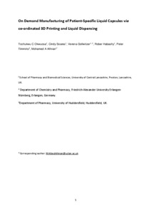 Okwuosa, Tochukwu Chijioke, Soares, Cindy, Golwitzer, Verena, Habashy, Rober, Timmins, Peter and Albed Alhnan, Mohamed (2018) On demand manufacturing of patient-specific liquid capsules via co-ordinated 3D printing and liquid dispensing. European Journal of Pharmaceutical Sciences, 118 . pp. 134-143. ISSN 0928-0987