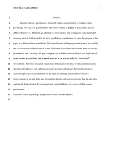 Sport psychology practitioners frequently utilize questionnaires to evaluate sport psychology services, yet questionnaires may not be valued as highly by the coaches and/or athletes themselves. Therefore, an alternative, more reliable and ecologically valid method of assessing mental skills is needed for sport psychology practitioners. As such, the purpose of this paper is to illustrate how an authentic field-based mental skills program assessment was used in the off-season for collegiate soccer teams. Following discussions between the sport psychology practitioners and coaching staff, pre- and post- test activities were developed and implemented on an outdoor soccer field, which was determined to be a more authentic “real-world” environment. Activities evaluated situational and tactical awareness, on-field communication, shooting self-efficacy, and performance under pressure and fatigue. The field assessment experience provided a good method for the sport psychology practitioners to observe improvements in mental skills, and the student-athletes and coaches reported that the activities and debrief demonstrated the involvement of mental skills in every aspect of their soccer performance.