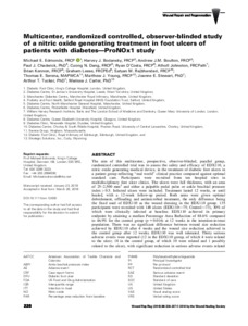 Edmonds, Michael E, Bodansky, Harvey J, Boulton, Andrew JM, Chadwick, Paul J, Dang, Cuong N, D'Costa, Ryan, Johnston, Atholl, Kennon, Brian, Leese, Graham et al (2018) Multicenter, randomized controlled, observer-blinded study of a nitric oxide generating treatment in foot ulcers of patients with diabetes - ProNOx1 study. Wound Repair and Regeneration, 26 (2). pp. 228-237. ISSN 1067-1927