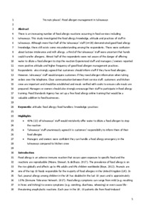 There is an increasing number of food allergic reactions occurring in food services including takeaways. This study investigated the food allergy knowledge, attitude and practices of staff in takeaways. Although more than half of the takeaways’ staff (n=28) demonstrated good food allergy knowledge, there still exists some misunderstanding among the respondents. There were confusion about lactose intolerance and milk allergy, a third of the takeaways’ staff were uncertain that hands could transfer allergens. Almost half of the respondents were not aware of the danger of offering water to dilute a food allergen to stop the reaction Experienced staff and managers / owners reported more positive attitude and higher frequency of good food allergen management practices. Respondents also strongly agreed that customers should inform staff if they have food allergies. However, takeaways’ staff would enquire customers if they need allergen information when taking orders over the telephone. Clear communication between front service staff, customers and kitchen crew are important and should be established and meals verified with cooks to ensure safe meals are prepared. Managers or owners should also strongly encourage their staff to participate in food allergy training. Food Standards Agency has set up a free food allergy online training that would be a valuable addition to food businesses.