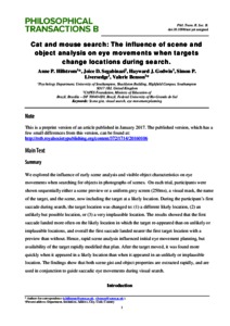 We explored the influence of early scene analysis and visible object characteristics on eye movements when searching for objects in photographs of scenes. On each trial, participants were shown sequentially either a scene preview or a uniform grey screen (250 ms), a visual mask, the name of the target and the scene, now including the target at a likely location. During the participant's first saccade during search, the target location was changed to: (i) a different likely location, (ii) an unlikely but possible location or (iii) a very implausible location. The results showed that the first saccade landed more often on the likely location in which the target re-appeared than on unlikely or implausible locations, and overall the first saccade landed nearer the first target location with a preview than without. Hence, rapid scene analysis influenced initial eye movement planning, but availability of the target rapidly modified that plan. After the target moved, it was found more quickly when it appeared in a likely location than when it appeared in an unlikely or implausible location. The findings show that both scene gist and object properties are extracted rapidly, and are used in conjunction to guide saccadic eye movements during visual search.