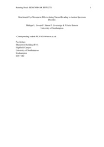 Howard, Philippa, Liversedge, Simon Paul orcid iconORCID: 0000-0002-8579-8546 and Benson, Valerie orcid iconORCID: 0000-0002-0351-4563 (2017) Benchmark eye movement effects during natural reading in autism spectrum disorder. Journal of Experimental Psychology: Learning, Memory, and Cognition, 43 (1). pp. 109-127. ISSN 0278-7393