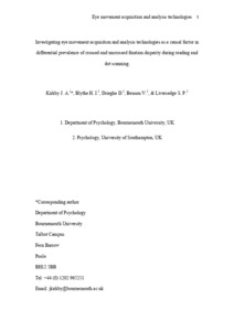 Kirkby, Julie A., Blythe, Hazel I., Drieghe, Denis, Benson, Valerie orcid iconORCID: 0000-0002-0351-4563 and Liversedge, Simon Paul orcid iconORCID: 0000-0002-8579-8546 (2013) Investigating eye movement acquisition and analysis technologies as a causal factor in differential prevalence of crossed and uncrossed fixation disparity during reading and dot scanning. Behavior Research Methods, 45 (3). pp. 664-678. ISSN 1554-351X
