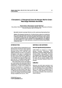 The triterpenoid clionasterol (1), a 29 carbon structure compound was isolated from the less polar extract (20% EtOAc in hexanes) of the green alga Halimeda macroloba collected at Shimoni near Mombasa, Kenya. The structure and relative stereochemistry of this compound was elucidated by spectroscopic data, mainly NMR and mass spectrometry. This metabolite was inactive against DLD-1 cells on the MTT (3-(4,5-dimethylthiazol-2-yl)-2,5-diphenyltetrazolium bromide) assay. Further experiments on mosquito larvae and brine shrimp lethality confirmed this result.