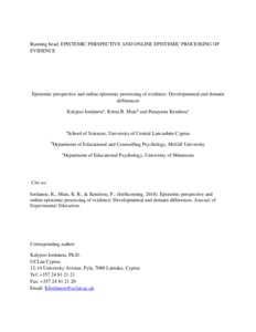 Relations between epistemic perspective and online epistemic processing of evidence when reading a text were examined. Thirty-seven young adolescents and 24 graduate university students were asked to read and think-aloud with two texts, one in the history domain and the other in the science domain. Participants also completed a prior-knowledge test and an instrument assessing their epistemic perspective. Results showed that participants who exhibited an evaluativist epistemic perspective and high prior-knowledge used the epistemic standard of scientific research more than participants who held non-evaluativist epistemic perspective. Furthermore, an age-related developmental difference was observed, with adults using the epistemic standard of scientific research more than young adolescents. Domain differences were observed in both participants’ epistemic perspective and online epistemic processing. Participants overall engaged in online epistemic processing of evidence more in the history topic than in the science topic.