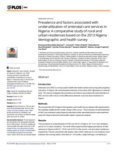 Adewuyi, Emmanuel Olorunleke, Auta, Asa orcid iconORCID: 0000-0001-6515-5802, Khanal, Vishnu, Bamidele, Olasunkanmi David, Akuoko, Cynthia Pomaa, Adefemi, Kazeem, Tapshak, Samson Joseph and Zhao, Yun (2018) Prevalence and factors associated with underutilization of antenatal care services in Nigeria: A comparative study of rural and urban residences based on the 2013 Nigeria demographic and health survey. PLOS ONE, 13 (5). e0197324.
