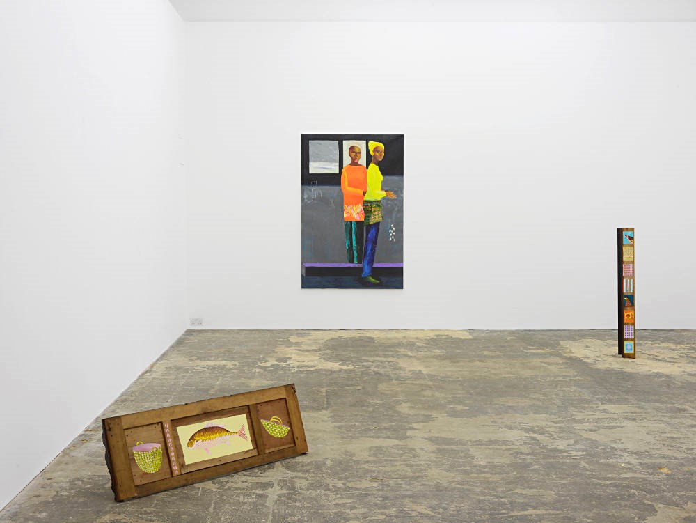 The eponymous The Tenderness Only we Can See is a painting on a piano part. Like an altarpiece the picture surface is partitioned in three parts, at the centre a fish in yellow, brown and pink on a light yellow background is surrounded by baskets. Chopin’s Heart, a piece of piano standing column-like, contrasts birds and patterns as if in a fabric sample book. Plants and animals, like patterns, traverse time and key into our register of recognition, assumption and place of cultural belonging. Painting British fish, for instance, is a strategy for recasting notions of the exotic, deconstructing that which is familiar, turning the everyday into ‘other’. The sh is silent whereas the pattern speaks a secret language. The baskets are women’s companions and familiars. The piano in contrast to a banjo is an instrument that straddles bourgeois drawing room entertainment, the concert hall, jazz club and more.