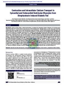 techniques from EPI and ENDO regions of the left ventricle. Contraction and free intracellular Ca2+ concentration (Ca2+)i were measured by video edge detection and fl uorescence photometry techniques, respectively. Myocyte length and calculated surface area were smaller in EPI-STZ compared to EPI-CON. Time to peak (TPK) shortening was prolonged in EPI-STZ compared to EPI-CON and in ENDO-STZ compared to ENDO-CON myocytes. Time to half (THALF) relaxation of shortening was prolonged in EPI-STZ compared to EPI-CON. TPK Ca2+ transient was prolonged in EPI-STZ compared to EPI-CON, ENDO-STZ compared to ENDO-CON, ENDO-STZ compared to EPI-STZ and in ENDO-CON compared to EPI-CON myocytes. THALF decay of the Ca2+ transient was prolonged in ENDO-STZ compared to ENDO-CON. Fractional release of Ca2+ was increased in ENDO-STZ compared to ENDO-CON and in ENDO-STZ compared to EPI-STZ. Recovery of the