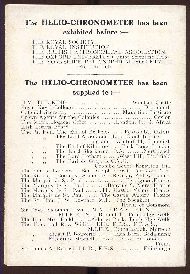 Promotional Material - who/where heliochronometer was supplied to, page 1