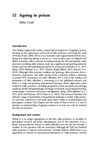 This chapter explores the nature, context and consequences of ageing in prison, focusing on the experiences and needs of older prisoners, and using the work of Nancy Fraser (2005, 2010) as an innovative and original framework for ana- lysing and exploring ageing in prison as a social justice issue. In England and Wales, and many other countries, including Ireland, the US and Australia, older prisoners, including older women, make up a significant and growing minority within a penal estate populated primarily by young men (Davoren et al., 2015; Mann, 2012; Baidawi et al., 2011; Human Rights Watch, 2012; Stevens et al., 2018). Although older prisoner numbers are growing, older prisoners form a minority of prisoners, and older women form a minority within a minority, as around 95% of prisoners are male (Wahidin, 2011). Just as the number and proportion of older offenders is increasing, so is the published research, and there is a large and growing international literature which approaches issues related to older prisoners including perspectives from psychiatry, psychology, medicine, health and gerontology, sociology, social work, social and penal policy, criminology, corrections and prison management (Aday, 2003; Baidawi et al., 2011; Kim and Peterson, 2014; Fazel et al., 2001). This research literature has utilised a range of quantitative and qualitative methods to render older prison- ers and their experiences and needs much more visible in criminological and penological contexts. This chapter uses the work of Nancy Fraser as a tool to develop an understanding of ageing in prison as an issue not only of criminal but also social justice.