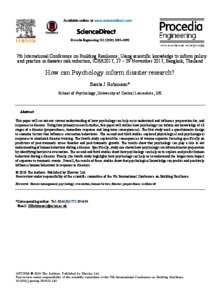 Robinson, Sarita Jane orcid iconORCID: 0000-0002-4237-5412 (2018) How can Psychology inform disaster research? Procedia Engineering, 212 . pp. 1083-1090. ISSN 1877-7058