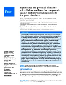 Adnan, Mohd, Alshammari, Eyad, Patel, Mitesh, Amir Ashraf, Syed, Khan, Saif and Hadi, Ss orcid iconORCID: 0000-0002-2994-3083 (2018) Significance and potential of marine microbial natural bioactive compounds against biofilms/biofouling: necessity for green chemistry. PeerJ, 6 . e5049.