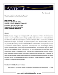 Mad Studies is an emerging new critical project. As such, its purpose and future direction is open to debate. In any new project, questions emerge regarding its boundaries; who is inside and outside, included or excluded? This paper explores questions of who (and what) is (or should be) included in the Mad Studies project. For example, we explore the place of those who are not ‘Mad positive’ or anti-psychiatry; the extent you need to be Mad identified to do Mad Studies; and the potential inclusion of a number of related conditions, experiences and perspectives (such as neurological diversity; chronic fatigues syndrome / myalgic encephalomyelitis ME/CFS; and psychedelic drug use). Whilst we do not argue that Mad Studies is exclusionary, nor that it should be all-inclusive, we do think it could be more attuned to potential exclusions, especially because these are often based on unhelpful binary oppositions (physical/mental; social/medical; psychiatry/anti psychiatry etc). Therefore, we make the case that Mad Studies could more explicitly interrogate underlying assumptions, not only of psychiatry and the ‘psy’ professionals, but also of pre-existing ‘critical’ approaches to madness. If so, it could be a truly ground breaking project.