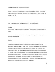 Cowley, Sarah, Whittaker, Karen orcid iconORCID: 0000-0002-3493-9396, Malone, Mary, Donetto, Sara, Grigulis, Astrida and Maben, Jill (2018) What makes health visiting successful – or not? 1. Universality. Journal of Health Visiting, 6 (7). pp. 352-360. ISSN 2050-8719
