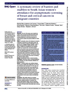A systematic review of barriers and enablers to South Asian women’s attendance for asymptomatic screening of breast and cervical cancers in emigrant countries.