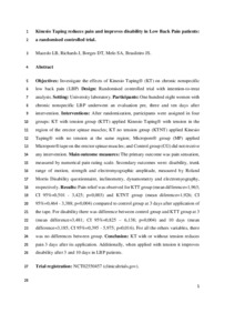 Macedo, LB, Richards, James orcid iconORCID: 0000-0002-4004-3115, Borges, DT, Melo, SA and Brasileiro, JS (2019) Kinesio Taping reduces pain and improves disability in Low Back Pain patients: a randomised controlled trial. Physiotherapy, 105 (1). pp. 65-75. ISSN 0031-9406