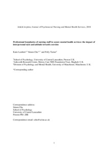 Lambert, Katie, Chu, Simon orcid iconORCID: 0000-0001-8921-4942 and Turner, Polly (2018) Professional boundaries of nursing staff in secure mental health services: the impact of interpersonal style and attitude towards coercion. Journal of Psychosocial Nursing and Mental Health Services . ISSN 0279-3695