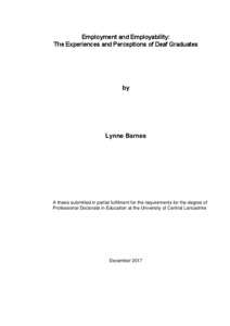 Barnes, Lynne orcid iconORCID: 0000-0003-4504-7139 (2017) Employment and Employability: The Experiences and Perceptions of Deaf Graduates. Doctoral thesis, University of Central Lancashire.