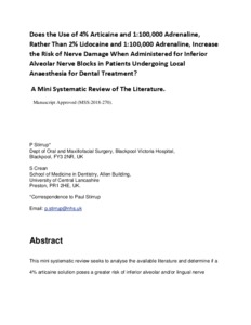 Does the Use of 4% Articaine and 1:100,000 Adrenaline, Rather Than 2% Lidocaine and 1:100,000 Adrenaline, Increase the Risk of Nerve Damage When Administered for Inferior Alveolar Nerve Blocks in Patients Undergoing Local Anaesthesia for Dental Treatment? A Mini Systematic Review of The Literature.