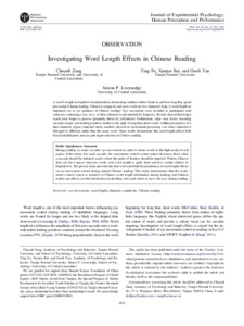 A word’s length in English is fundamental in determining whether readers fixate it, and how long they spend processing it during reading. Chinese is unspaced and most words are two characters long: Is word length an important cue to eye guidance in Chinese reading? Eye movements were recorded as participants read sentences containing a one-, two-, or three-character word matched for frequency. Results showed that longer words took longer to process (primarily driven by refixations). Furthermore, skips were fewer, incoming saccades longer and landing positions further to the right of long than short words. Additional analyses of a three-character region (matched stroke number) showed an incremental processing cost when character(s) belonged to different, rather than the same, word. These results demonstrate that word length affects both lexical identification and saccade target selection in Chinese reading.