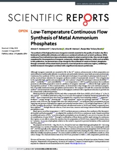Eccles, Harry orcid iconORCID: 0000-0002-1652-3370, holdsworth, A F, Mao, Runjie, Bond, Gary orcid iconORCID: 0000-0001-5347-2341 and Halman, Alice (2018) Low-Temperature Continuous Flow Synthesis of Metal Ammonium Phosphates. Nature Scientific Reports, 8 . ISSN 0028-0836