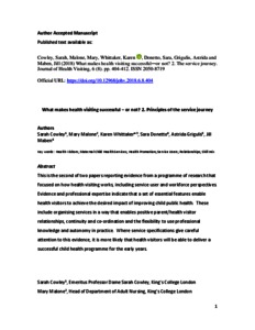 This is the second of two articles reporting evidence from a programme of research that focused on how health visiting works, including service user and workforce perspectives. Evidence and professional expertise indicate that a set of essential features enable health visitors to achieve the desired impact of improving child public health. These include organising services in a way that enables positive parent–health visitor relationships, continuity and co-ordination and the flexibility to use professional knowledge and autonomy in practice. Where service specifications give careful attention to this evidence, it is more likely that health visitors will be able to deliver a successful child health programme for the early years.