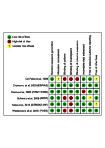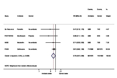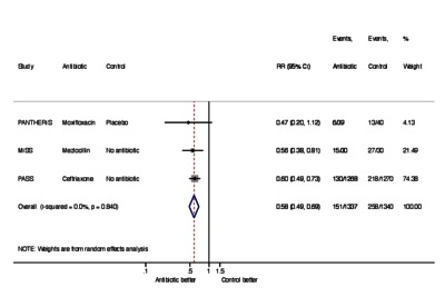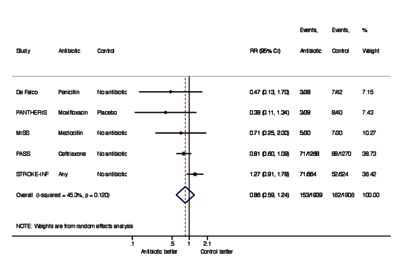 Pneumonia is a common complication after stroke which increases morbidity and mortality. This systematic review was conducted to evaluate the efficacy and safety of antibiotics for the prevention of pneumonia after acute stroke. Medline, EMBASE, and Cochrane databases were searched for randomized controlled trials comparing preventive antibiotics to placebo or no antibiotics after acute stroke. The primary outcome was poststroke pneumonia. Secondary outcomes were all infections, urinary tract infections, death, dependency, length of hospital stay, and adverse events. Treatment effects were summarized using random effects metaanalysis. Six trials (4111 patients) were eligible for inclusion. The median National Institute of Health Stroke Scale score in included trials ranged from 5 to 16.5. The proportion of dysphagia ranged from 26% to 100%. Preventive antibiotics were commenced within 48 hours after acute stroke. Compared to control, preventive antibiotics reduced the risk of poststroke pneumonia (RR .75, 95%CI ·.57-.99), and all infections (RR .58, 95%CI .48-.69). There was no significant difference in the risks of dependency (RR 0.99, 95%CI 0·80-1·11), or mortality (RR .96, 95%CI .78-1.19) between the preventive antibiotics and control groups. Preventive antibiotics did not increase the risk of elevated liver enzymes (RR 1.20, 95% CI .97-1.49). Preventive antibiotics had uncertain effects on the risks of other adverse events. Preventive antibiotics reduced the risk of post-stroke pneumonia. However, there is insufficient evidence to currently recommend routine use of preventive antibiotics after acute stroke. [Abstract copyright: Copyright © 2018. Published by Elsevier Inc.]