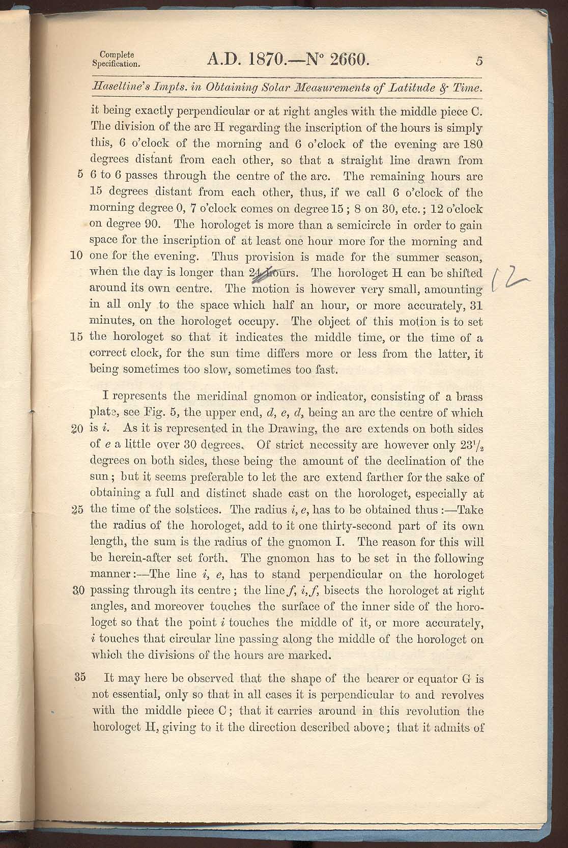 George Haseltine (1870) Patent for 'Instruments for obtaining solar measurements of latitude and time', page 5. 2660.