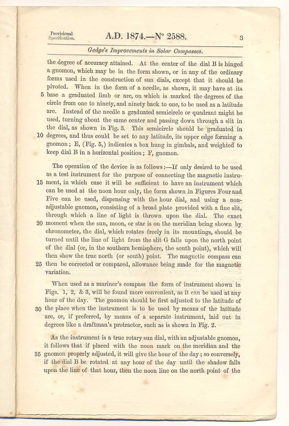 William Edward Gedge (1874) Patent for 'Solar Compasses', page 3. 2588.