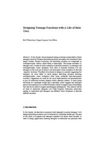 In this chapter, two participatory design activities are described in which teenagers create lo-fi designs describing emotions and explain the rationale for their design choices. Designs annotating and describing emotions are categorised as anthropomorphic, abstract, object based, or biomorphic. The chapter concludes: (i) teenagers use a variety of visual metaphors to describe emotions, (ii) teenagers use anthropomorphic visual metaphors most often to describe emotions and (iii) teenagers make more use of abstract and biomorphic visual metaphors to describe ‘negative’ emotions. The effect of materials on designs is analysed, suggesting that teenagers are more likely to create designs describing emotions featuring anthropomorphic visual metaphors when using malleable three-dimensional materials. Suggestions are made for the use of externalisation and personification as part of interactive emotion displays within affective systems. A focus group evaluation of a prototype mobile app is described, which suggests that teenagers place more importance on an affective systems ability to support social relationships than they do its ability to support psychological development. This research will be of value to interaction designers and Child-Computer Interaction researchers seeking to understand how teenagers use different visual metaphors to describe different emotions.