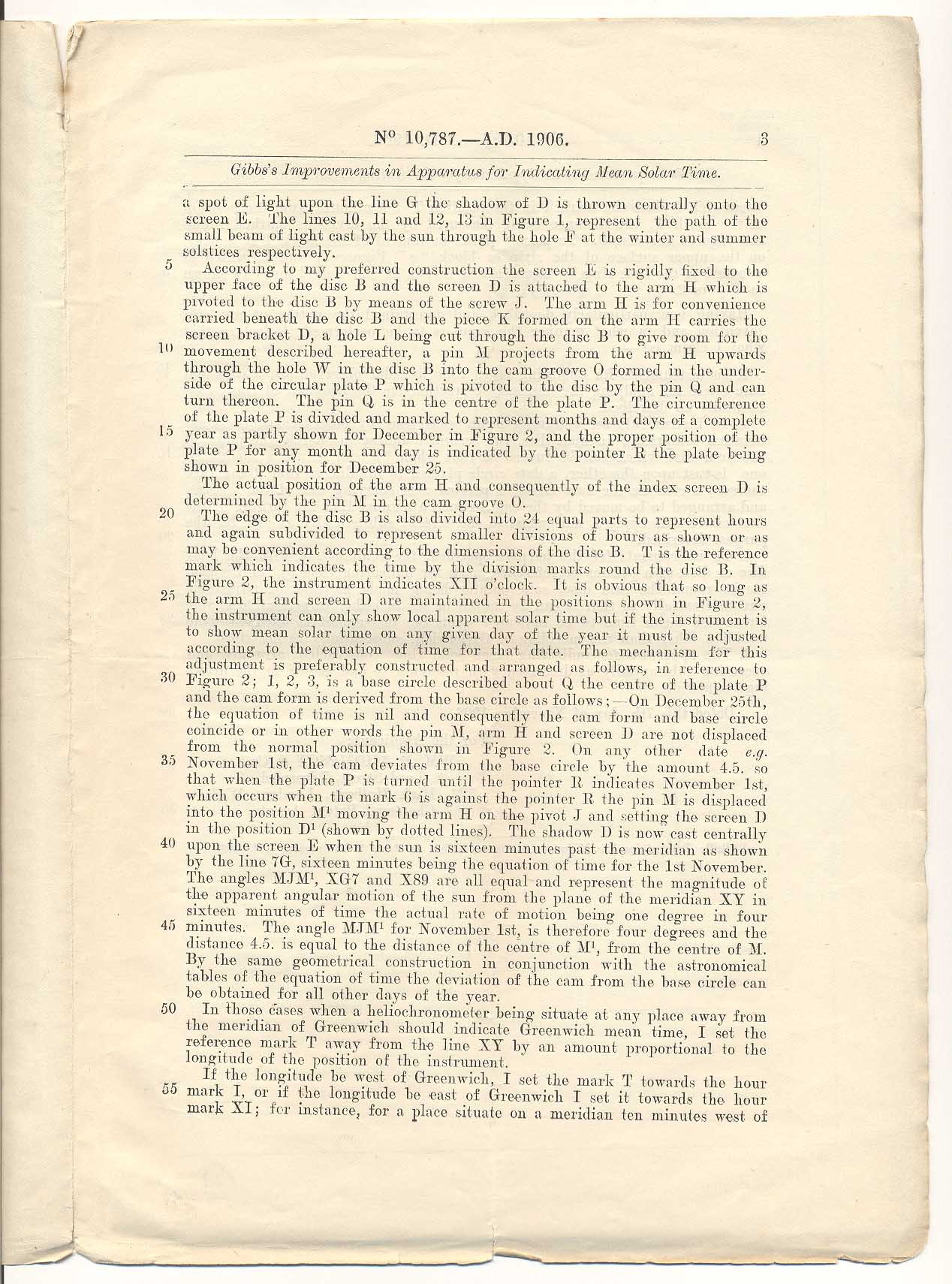 George J. Gibbs (1906) Patent for 'Gibbs’ Heliochronometer', page 3. 10787.