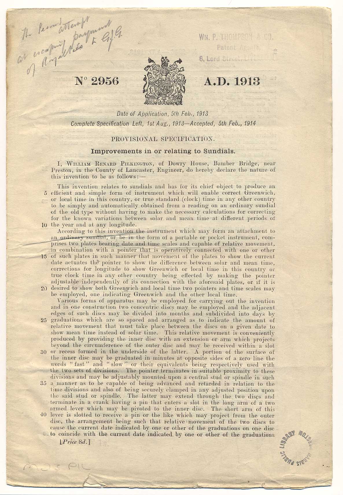 William Renard Pilkington (1913) Patent for 'Pilkington’s Mechanical Equation Table', page 1. 2956.