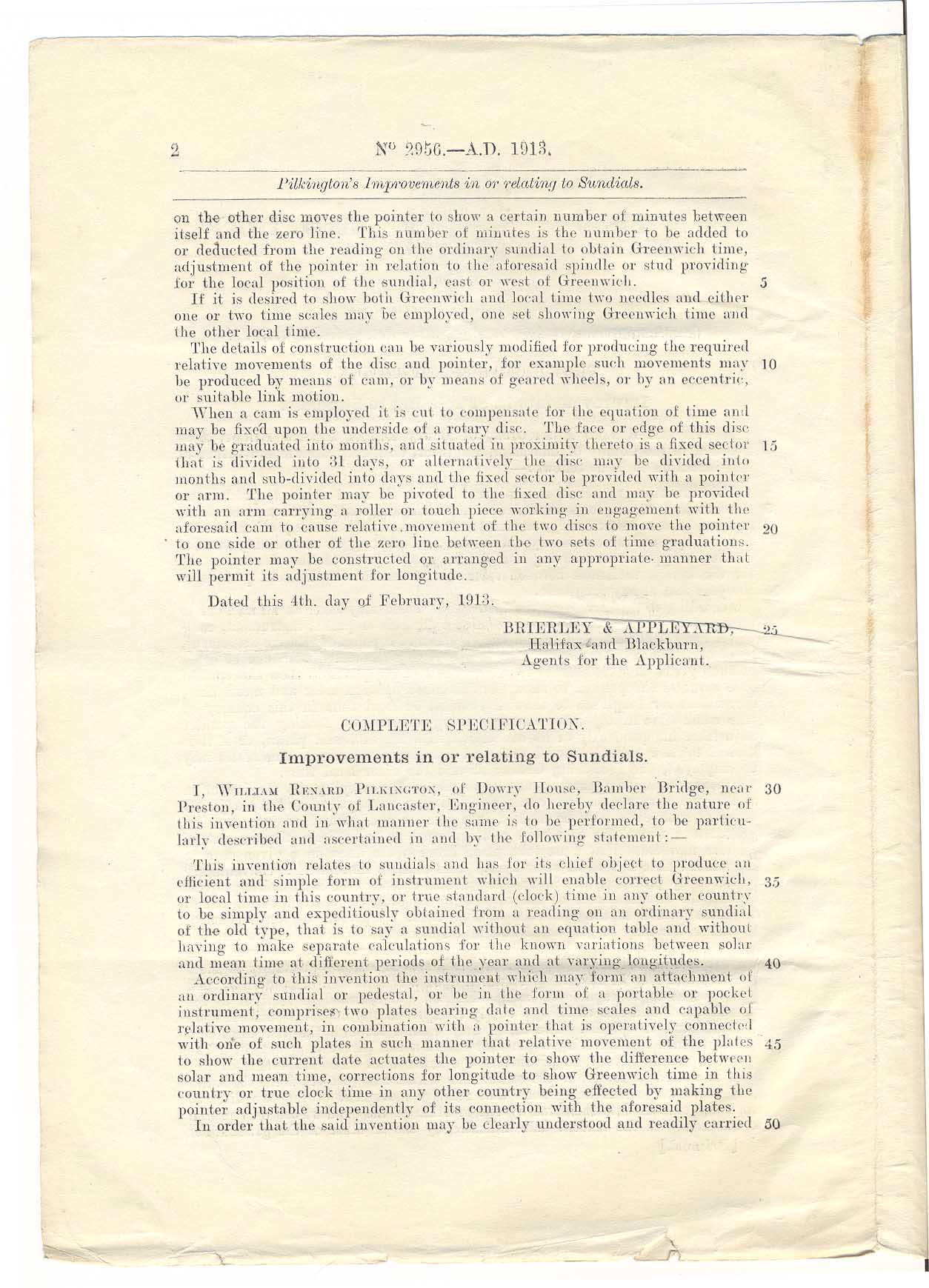 William Renard Pilkington (1913) Patent for 'Pilkington’s Mechanical Equation Table', page 2. 2956.