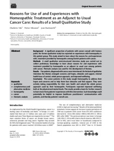 Reasons for Use of and Experiences with Homeopathic Treatment as an Adjunct to Usual Cancer Care: Results of a Small Qualitative Study.
