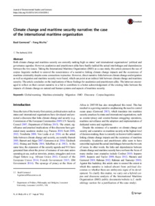 governance agendas. However, academics and practitioners alike have hardly tackled the actual interlinkages and dependencies between the two issues. Taking the International Maritime Organization (IMO) as a case study, this article pioneers the use of corpus linguistic method to unravel the nonexistence of a narrative linking climate change impacts and the occurrence of maritime criminality despite some connections in practice. However, direct narrative links between climate change and migration as well as migration and maritime security were found, which can point at an indirect link between climate change and maritime security. The article concludes on the implications of these findings for academics and practitioners alike. The latter are encouraged to reflect on their current narrative in a bid to contribute to a better acknowledgement of the existing links between the impacts of climate change on natural and human systems and aspects of maritime security.