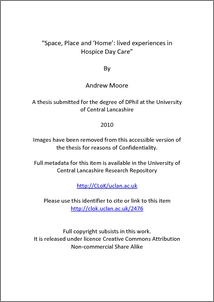 Moore, Andrew (2010) Space, Place and Home: Lived experiences of hospice day care. Doctoral thesis, University of Central Lancashire.