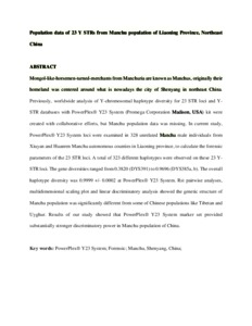 Mongol-like-horsemen-turned-merchants from Manchuria are known as Manchus, originally their homeland was centered around what is nowadays the city of Shenyang in Northeast China. Previously, worldwide analysis of Y-chromosomal haplotype diversity for 23 STR loci and Y-STR databases with PowerPlex® Y23 System (Promega Corporation Madison, USA) kit were created with collaborative efforts, but Manchu population data was missing. In current study, PowerPlex® Y23 System loci were examined in 328 unrelated Manchu male individuals from Xiuyan and Huanren Manchu autonomous counties in Liaoning province, to calculate the forensic parameters of the 23 STR loci. A total of 323 different haplotypes were observed on these 23 Y-STR loci. The gene diversities ranged from 0.3820 (DYS391) to 0.9696 (DYS385a, b). The overall haplotype diversity was 0.9999 ± 0.0002 at PowerPlex® Y23 System. Rst pairwise analyses, multidimensional scaling plot, and linear discriminatory analysis showed the genetic structure of Manchu population was significantly different from some of Chinese populations like Tibetan and Uyghur. Results of our study showed that PowerPlex® Y23 System marker set provided substantially stronger discriminatory power in Manchu population of China.