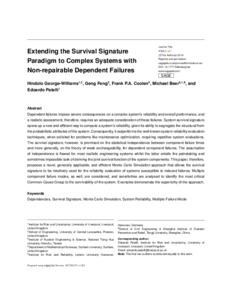 George-Williams, Hindolo, Feng, Geng orcid iconORCID: 0000-0002-4705-3252, Coolen, Frank PA, Beer, Michael and Patelli, Edoardo (2019) Extending the survival signature paradigm to complex systems with non-repairable dependent failures. Proceedings of the Institution of Mechanical Engineers, Part O: Journal of Risk and Reliability, 233 (4). pp. 505-519. ISSN 1748-006X