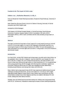 This article presents the importance of peer support for young people growing up with HIV in the UK. We provide insight in to some of the challenges young people experience, by reviewing the impact of CHIVA camp: Freedom to Be (F2B). The socio-demographics of camp participants over the last 8 years are shown and Young people’s voices are included to demonstrate impact.