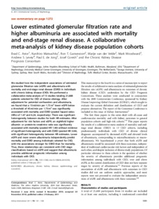 Astor, Brad C, Matsushita, Kunihiro, Gansevoort, Ron T, van der Velde, Marije, Woodward, Mark, Levey, Andrew S, Jong, Paul E de, Coresh, Josef, Astor, Brad C et al (2011) Lower estimated glomerular filtration rate and higher albuminuria are associated with mortality and end-stage renal disease. A collaborative meta-analysis of kidney disease population cohorts. Kidney International, 79 (12). pp. 1331-1340. ISSN 0085-2538