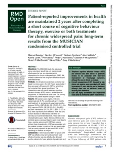 Patient-reported improvements in health are maintained 2 years after completing a short course of cognitive behaviour therapy, exercise or both treatments for chronic widespread pain: long-term results from the MUSICIAN randomised controlled trial.