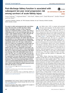 Post-discharge kidney function is associated with subsequent ten-year renal progression risk among survivors of acute kidney injury.
